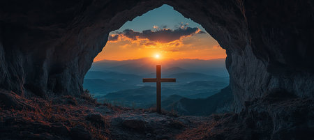 Sunset and Wooden Cross within Cave on Mountain Top with Scenic Landscape View of Nature