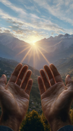 Hands Reaching for the Sunrise in a Majestic Mountain Landscape