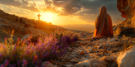 Jesus Christ with the cross on the background of the sunset over the valley