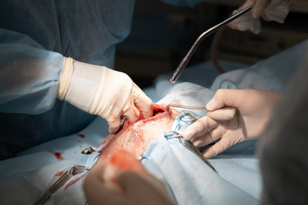 Team of professional doctors operating a patient conducting open cut surgery in surgical room. Healthcare and medical intervention concept
