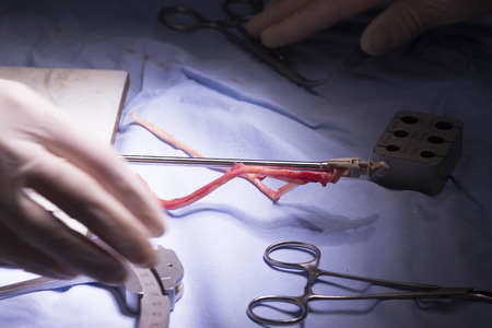 Photo of a real operation on the spine. The surgeon and assistant perform the treatment. In the frame of a medical instrument and blood suction. There are bloodstains on the sheet.