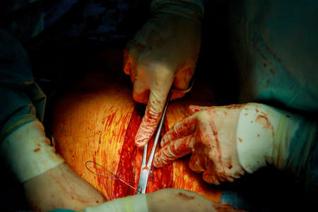 Close up of patients wound and medical workers hand in sterile gloves doing abdominoplasty surgery. Plastic surgeon and assistant using medical instruments. Concept of medicine, abdominoplasty.