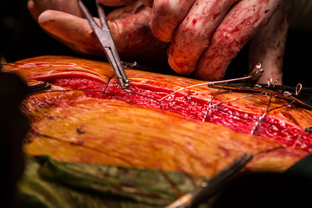 Surgeon begins to sew the wound on the leg after the operation emergency room.
