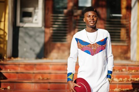 Stylish trendy afro france man in red hat and white outfit posed at autumn day. Black african model guy.