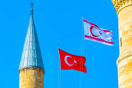 Flags of Turkey and Republic of Northern Cyprus waving between steeples of Selimiye mosque at Lefkosa, Cyprus