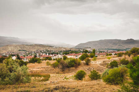 Scenic Cappadocia countryside houses along the road from goreme with scenic landscape. Real estate in central anatolia. Turkey