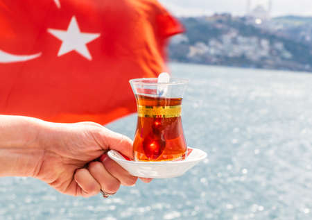hand with turkish tea cup and flag. Travel concept