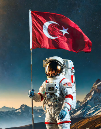 Soldiers stand in salute against a towering Turkish flag, symbolizing respect and tribute, set against a stunning backdrop of bright blue skies.