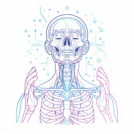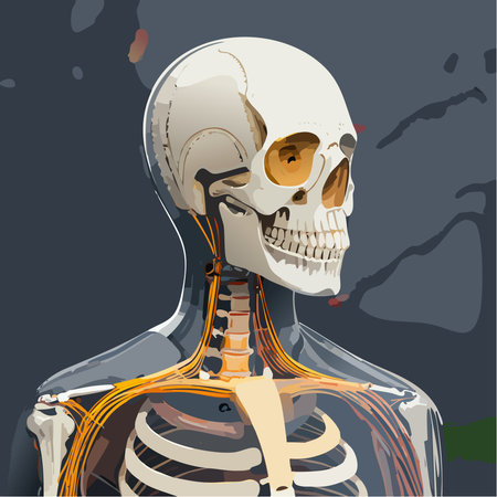High-detail vector illustration of a transparent human skull and upper body anatomy showing bones, spine, and nervous system elements.