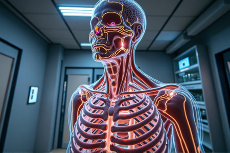 Futuristic anatomy visualization with illuminated human skeleton and organs. That the image is generated using AI.