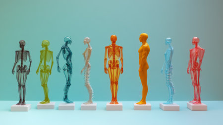 Brightly colored skeleton models are arranged in a row on a flat surface showcasing human anatomy details for educational purposes.