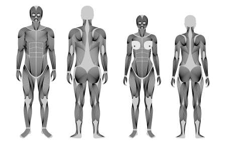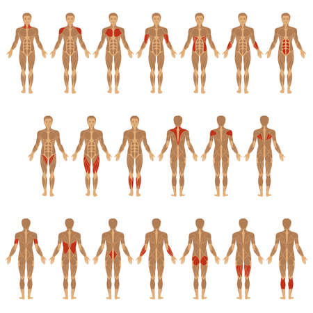 A detailed anatomical representation of the human muscular system, showcasing front, side, and rear views.
