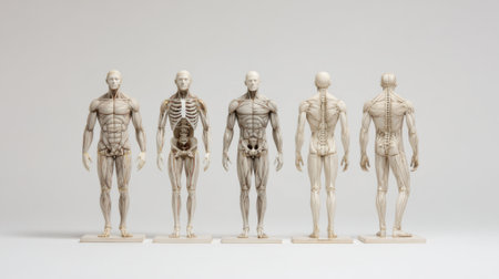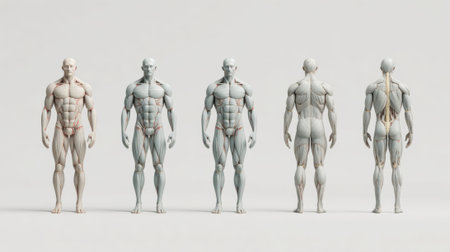 A collection of five anatomical models showcasing the human muscular and skeletal systems from various angles.