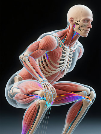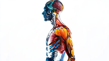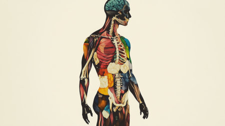 Explore a vibrant illustration of human anatomy, showcasing detailed muscles, internal organs, and systems. Ideal for educational and medical use.