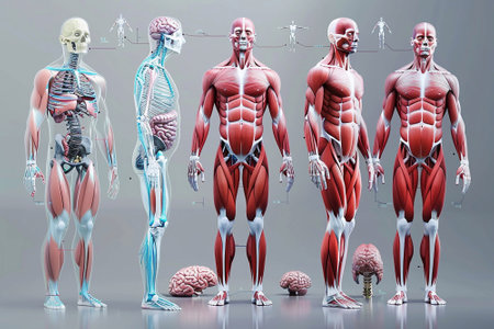Detailed 3D model of human anatomy, showcasing muscles and internal organs. Accompanied by anatomical charts and diagrams.