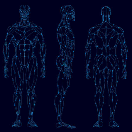 Set with the contours of the muscular structure of a person from blue lines isolated on a dark background. Front, side, back view. Vector illustration