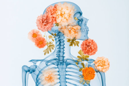 Aesthetic floral skeleton illustration showcasing a human skeleton adorned with vibrant flowers, representing life, beauty, and nature s harmony