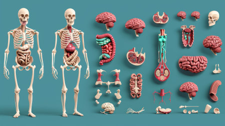 Human anatomy model showing internal organs, skeletal system, and digestive system on white background. Concept of medical education, biology learning, healthcare training, and human body structure.