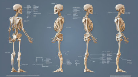 Detailed illustration of man's skeleton in front, profile, and back view. Halloween, medical, educational, or science banner.