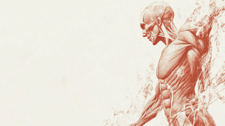 A man's body is shown in detail, with the muscles and bones clearly visible. Concept of realism and scientific accuracy, as if it were a model of the human body