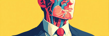 A flat illustration features a man in a suit with half his face revealing internal organs.