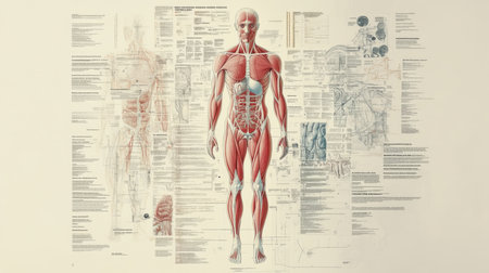 Vintage anatomical chart showcasing the human muscular system. A detailed illustration for education or medical reference.