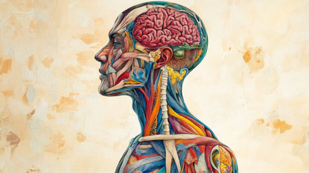 Vivid anatomical illustration showcasing the intricate details of the human body, emphasizing the brain, nervous system, and vascular structures for educational and artistic purposes.