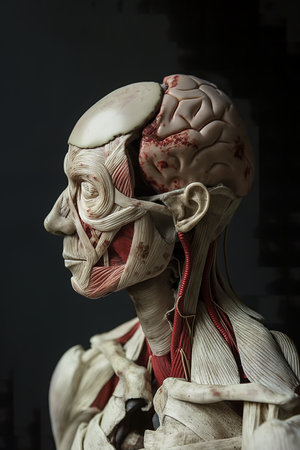 This image portrays an intricate anatomical model of the human face, showcasing muscles and the skull in a detailed side profile view. Ideal for educational use.