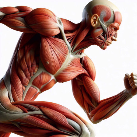 A vibrant close-up reveals the intricate details of muscle anatomy, emphasizing red and white structures on a model of a human figure.