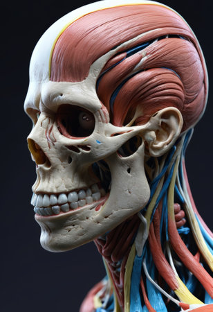 An anatomical model displays the intricate muscles, nerves, and blood vessels of the human head and neck, a tool for medical education.