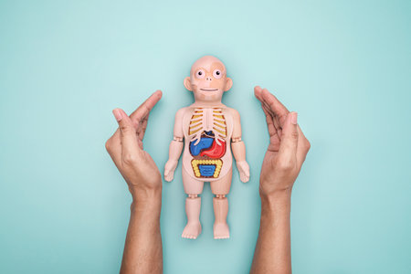 Artificial human body model. Biology class. Anatomy teaching aid. Education concept.