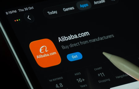 Dhaka, Bangladesh- 21 Nov 2025: Alibaba.com app displayed on a iPad screen in dark mode with a digital pen pointing at it.