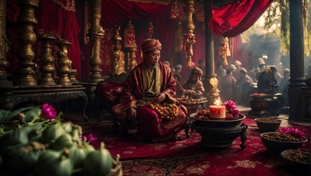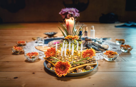A Beautiful and Colorful Spiritual Altar Surrounded by Candles and Fresh Flowers.