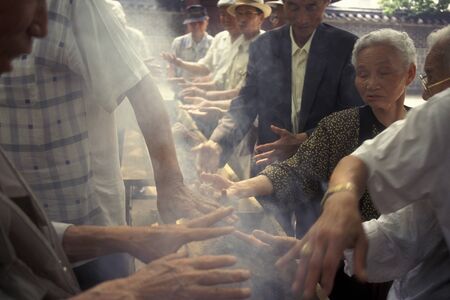 BEIJING / CHINA - JULY 15 2017: A man and a woman burn incense at the prayer during their visit to a temple in Asia. Apart from smell, the incense also secretes a lot of smoke.