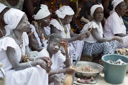adzopé, ivory coast-august 31, 2016: group of people sitting on stools dressed in white powder on the body with necklaces and bracelets and everyone looks to his direction.