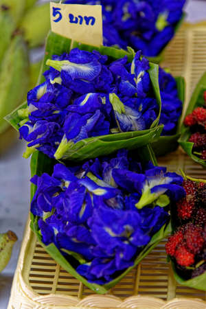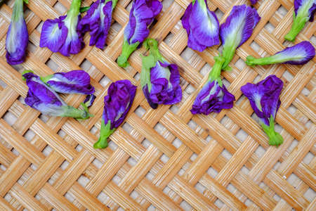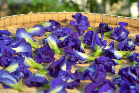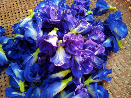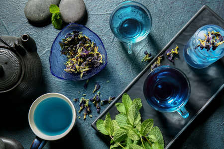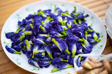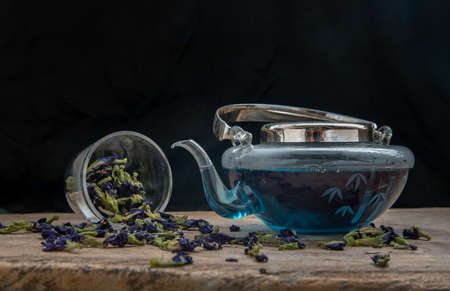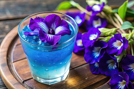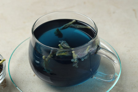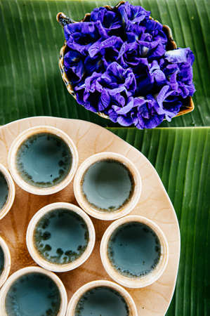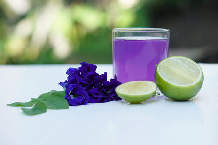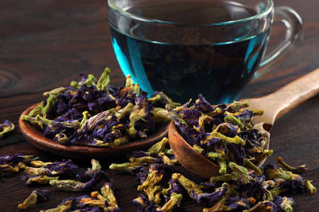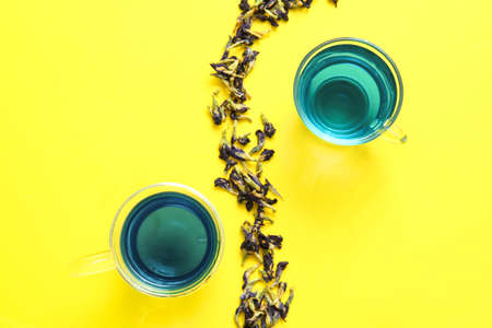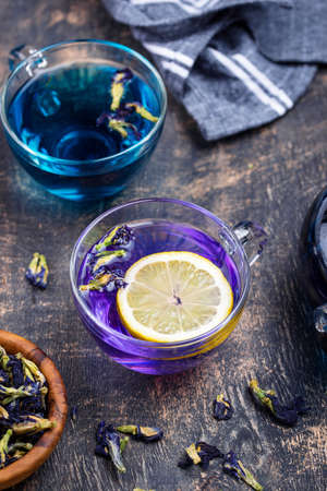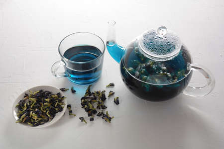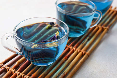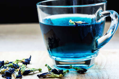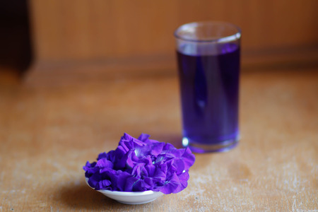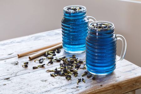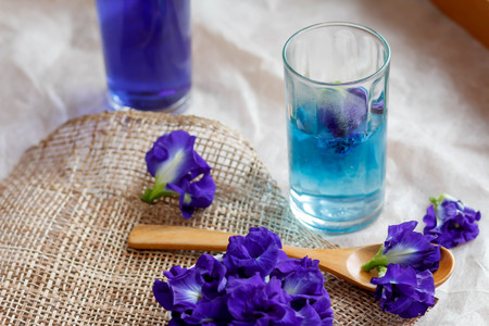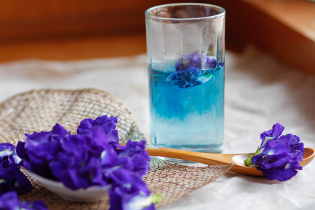 Healthy Blue Butterfly Pea Tea from flowers Clitoria ternatea plant or Asian pegion wings . Detox, antioxidant, anti-stress, anti- ageing beverage popular in Thailand, Vietnam, Bali, Malaysia.