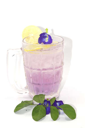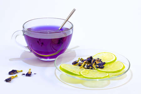 Cup of Anchan or Butterfly pea tea with Clitoria dry flowers. Blue tea in glass cup with slices of lime and dry flowers isolated on white background. Tea has a purple color due to the addition of lime