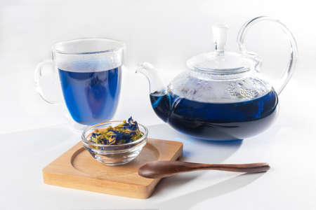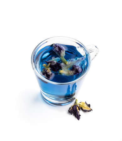 Cup of Anchan or Butterfly pea tea with dry flowers of clitoria. Blue tea in a transparent glass cup with dry flowers isolated on white background.