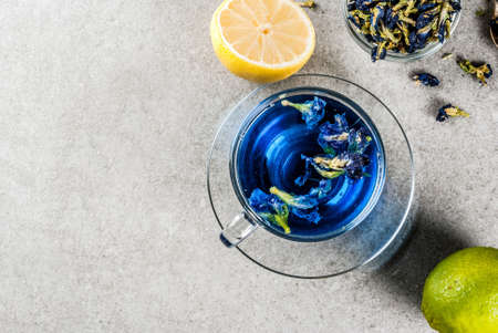 Healthy drinks, organic blue butterfly pea flower tea with limes and lemons, grey concrete background copy space top view