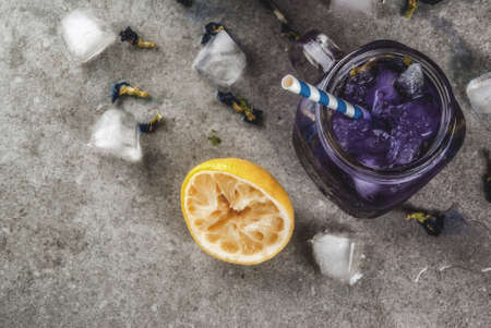 Healthy summer cold beverage, iced organic blue and violet butterfly pea flower tea with limes and lemons, grey concrete background copy space top view