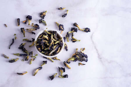 Butterfly pea flower tea in bowl, dry petals of herbal blue tea scattered over marble background.