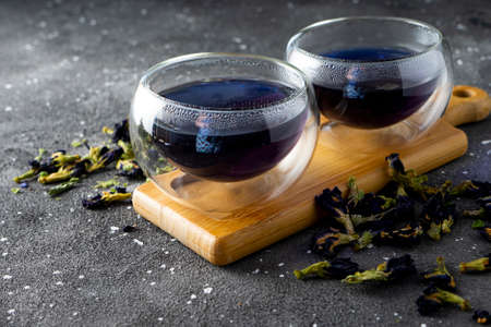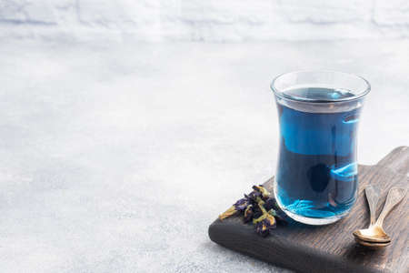 Butterfly pea flower tea is a caffeine free herbal tea and retains has many of the medicinal properties of the Clitoria ternatea plant. Exotic blue pea tea backgrund with copy space.