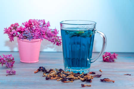 Organic Butterfly pea flowers blue Anchan tea in a glass cup and lilac flowers. Detox healthy drink.
