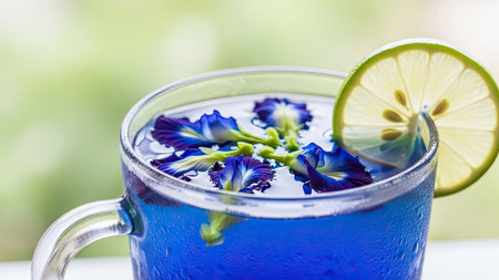 butterfly pea tea petal violet herbal antioxidant blue purple drink relax beverage photo business