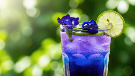 A vibrant blue drink garnished with delicate flower petals, surrounded by fresh greenery. Ideal for summer gatherings, parties, or a refreshing break.