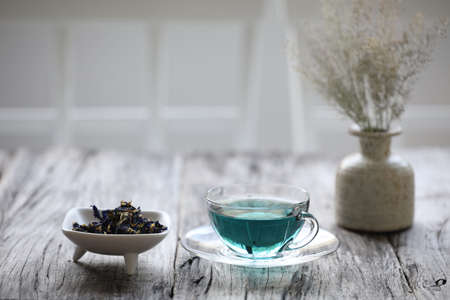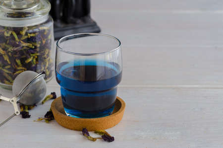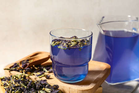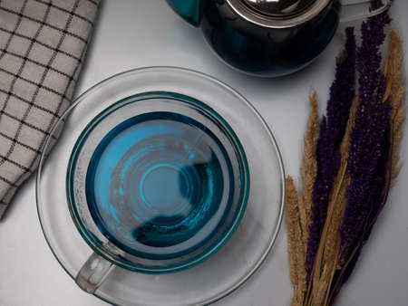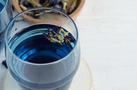 Organic Butterfly pea flowers blue Anchan tea in a glass cup. Detox healthy drink.