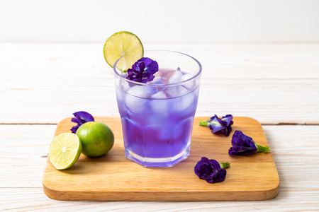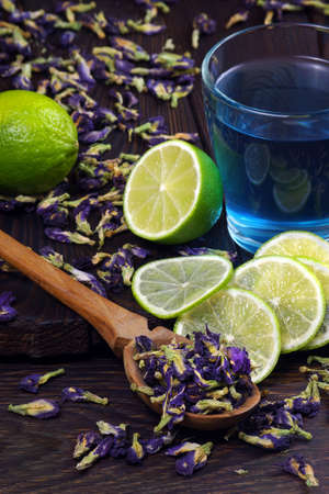 anchan drink on a wooden table. cup of Butterfly pea tea and lime.