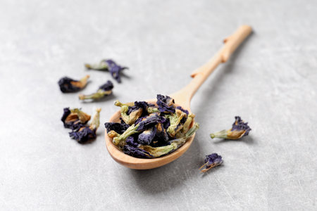 Spoon and dry organic blue Anchan on light gray table. herbal tea