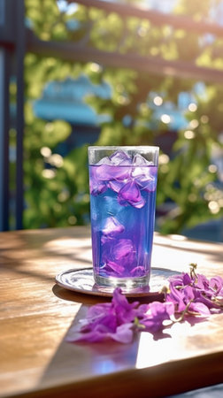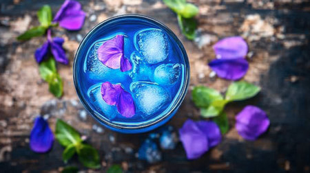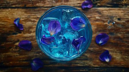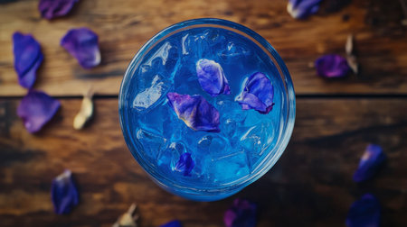 Vivid blue drink served in a glass with ice and flower petals, perfect for summer vibes. Aesthetic presentation on rustic wooden table evokes relaxation and nature.