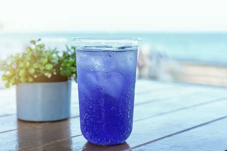 Glass with blue anchan tea on wooden background, iced butterfly pea flower with dry petals.